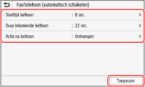 Als [Fax/telefoon (automatisch schakelen)] is ingeschakeld om te bepalen of de binnenkomende oproep een fax is, kunt u ook instellingen zoals de beltijd kiezen.