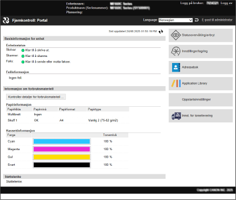 Når du logger inn på Fjernkontroll, vises portalsiden (fremsiden for Fjernkontroll). Herfra kan du sjekke brukstatus for maskinen, vise ulik informasjon og endre innstillingene ved bruk av knapper.