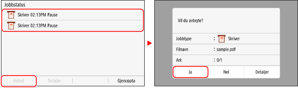 Hvis skjermbildet for jobbliste vises, velger du hvilken jobb som skal kanselleres, og trykk på [Avbryt]