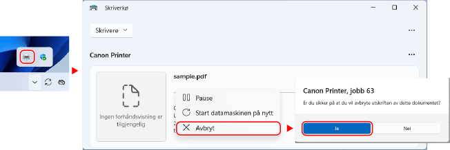 Hvis skjermbildet ovenfor ikke vises, dobbeltklikker du på skriverikonet i varslingsfeltet i Windows, velger dokumentet som skal avbrytes og høyreklikker på