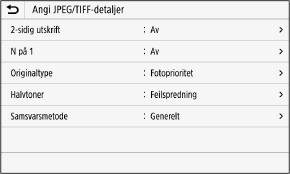 Når du vil vise dette skjermbildet, trykker du på [Angi JPEG/TIFF-det.] på skjermbildet for innstillinger for minnemedia-utskrift.