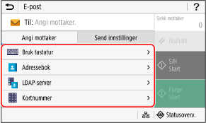 Hvis mottakeren ved sending er begrenset på grunn av godkjenningsinnstillingene for send-funksjonen, kan du ikke angi en annen mottaker. Kontakt administrator hvis du trenger mer informasjon.