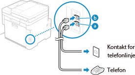 5 | Koble den medfølgende telefonlinjekabelen til kontakten for telefonlinjen ( ) på maskinen og vegguttaket.![]() Koble telefonen til den eksterne telefonkontakten ( ) på maskinen.Når du kobler til en telefon med faksfunksjon, må du deaktivere innstillingen for automatisk mottak av faks, på telefonen. Avhengig av typen telefon som er koblet til den, kan det hende at maskinen ikke kan sende eller motta fakser riktig. |