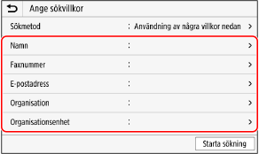 Tryck på [E-postadress], [I-faxadress] eller [Faxnummer] och ange mottagarinformationen. Tryck sedan på [Använd].