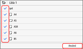 Avmarkera kryssrutorna för de pappersformat som ska döljas och klicka på [Använd].