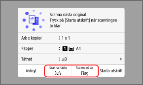 1 | Placera nästa original på glasskivan och tryck på [Scanna nästa Sv/v] eller [Scanna nästa Färg]. Nästa original skannas och samma skärm visas. Upprepa detta tills alla original har skannats. Du kan välja färgläge (svartvitt eller färg) för respektive original. När du vill kopiera nästa original i svartvitt trycker du på [Scanna nästa Sv/v]. När du vill kopiera i färg trycker du på [Scanna nästa Färg]. Du kan även trycka på [Täthet], [Originaltyp] och [Färgbalans] för att ändra inställningar för respektive original. Om originalets format är ett annat kan delar av bilden saknas eller bilden bli mindre när den skrivs ut. |