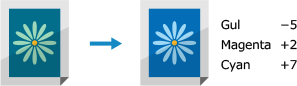 Du kan justera nivån för gult, magenta, cyan och svart när du vill göra färgerna på kopian mer lika originalet eller klarare än på originalet.