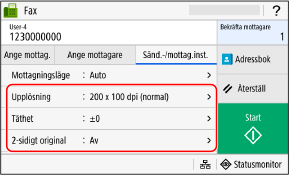 Tryck på [Statusmonitor] om du vill se sändningsstatus och -logg. Kontrollera status och logg för skickade och mottagna fax