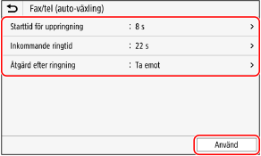 Ange tiden för ringsignalen och åtgärder när ett fax tas emot. Tryck sedan på [Använd].