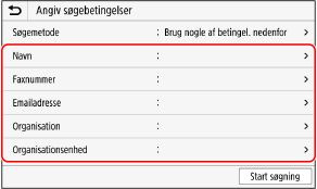 4 | Vælg [Søgemetode], og vælg søgebetingelserne. For at søge efter brugere, som imødekommer alle elementer angivet i trin 3, skal du vælge [Brug alle betingelser nedenfor]. For at søge efter brugere, som imødekommer nogen af elementerne angivet i trin 3, skal du vælge [Brug nogle af betingel. nedenfor]. |