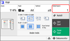 Tryk på [Antal kopier], brug de numeriske taster til at indtaste antallet af kopier, og tryk derefter på [Luk].