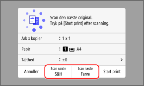 Hvis [Scan næste] vises, skal du placere det næste pas på glaspladen og trykke på [Scan næste S&H] eller [Scan næste Farvet].