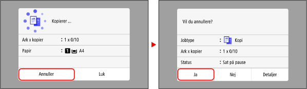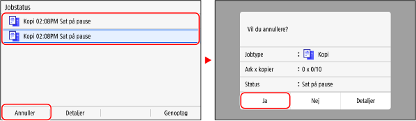 Hvis joblisteskærmen vises, skal du vælge det job, der skal annulleres, og tryk så på [Annuller]