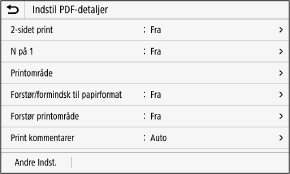 For at få vist skærmen skal du trykke på [Indstil PDF-detaljer] på indstillingsskærmen for udskrivning fra hukommelsesmedier.