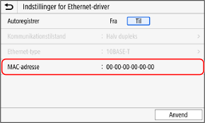 Du kan få vist den MAC-adresse, der er indstillet til maskinen, når maskinen er tilsluttet det kabelbaserede LAN.