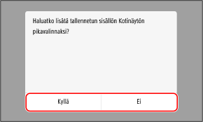 Jos valitaan [Kyllä], ilmoitus pikavalintapainikkeesta tulee esiin. Paina [OK], jos haluat lisätä pikavalintapainikkeen [Koti]-näyttöön.