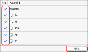 Paperiasetusnäytössä näytetään rekisteröidyt, usein käytettävät paperikoot. Jos käyttämättömiä paperikokoja näytetään, voit piilottaa ne kustakin paperilähteestä paperikoon valitsemisen helpottamiseksi.