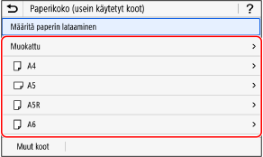 Jos paperi lisätään vaakasuunnassa, valitse [A5]. Jos paperi lisätään pystysuunnassa, valitse [A5R].