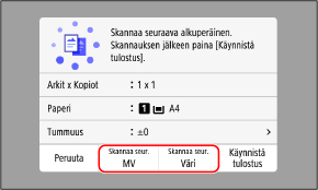 1 | Aseta seuraava alkuperäinen valotuslasille ja paina [Skannaa seur. MV] tai [Skannaa seur. Väri]. Seuraava alkuperäinen skannataan, ja sama näyttö tulee esiin. Toista tätä prosessia, kunnes kaikki alkuperäiset on skannattu. Voit valita väritilan (mustavalkoinen tai värillinen) jokaiselle alkuperäiselle. Jos haluat kopioida seuraavan alkuperäisen mustavalkoisena, paina [Skannaa seur. MV]. Jos haluat kopioida sen värillisenä, paina [Skannaa seur. Väri]. Voit muuttaa kunkin alkuperäisen asetuksia myös painamalla [Tummuus], [Alkuper. tyyppi] ja [Väritasapaino]. Jos alkuperäisen koko on erilainen, osa kuvasta saattaa puuttua tai kuva saatetaan tulostaa paperille pienempänä. |