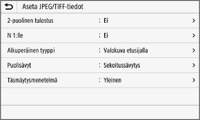 Määritä tämän näytön avulla JPEG- ja TIFF-tiedostojen tulostuksen lisäasetukset, kuten kuvanlaadun säätäminen.