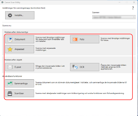Skannaa helposti käyttämällä tarkoitukseen sopivaa asetusta. Lähetä skannattu data määritettyyn sovellukseen sen näyttämistä ja sähköpostina lähettämistä varten. Voit myös käyttää ScanGear MF -näyttöä lisäasetusten määrittämiseen.
