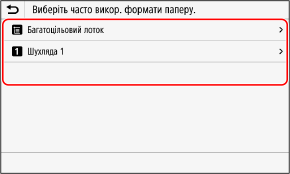 На екрані параметрів паперу відображаються зареєстровані розміри паперу, що часто використовуються. Якщо відображаються невикористовувані розміри паперу, їх можна приховати для кожного джерела паперу, щоб полегшити вибір розміру паперу.