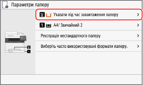 Якщо ви завжди використовуєте той самий папір у багатоцільовому лотку, можна зареєструвати його формат і тип. Екран параметрів паперу перестане відображатися, і вам не доведеться налаштовувати параметри.