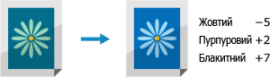 Можна налаштувати рівні жовтого, пурпурового, блакитного й чорного кольорів, щоб копіювати з більш правдивою передачею кольорів, як на оригінальному примірнику, або більш чітким відображенням, ніж на оригінальному примірнику.