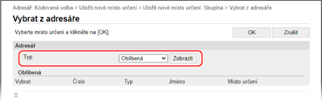 V části [Typ] vyberte možnost [Oblíbená] nebo [Kódovaná volba] a klikněte na možnost [Zobrazit] pro změnu zobrazení adresáře.