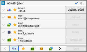Pokud vyvoláte adresář z obrazovky [Domů] nebo z obrazovek skenování či faxování, objeví se následující obrazovka.