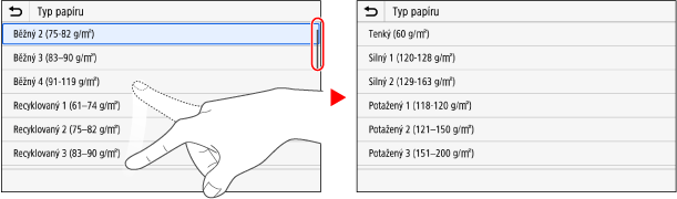 Když se na obrazovce objeví posuvník, znamená to, že jsou k dispozici položky nebo informace, které nelze na obrazovce zcela zobrazit. Potažením nebo přetažením se posouváte ve směru pohybu vašeho prstu.