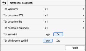 [Tón vyzvánění], [Tón dokončení VYS.], [Tón dokončení PŘ.], [Tón dokončení skenování] (Pro modely s funkcí faxu)