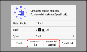 Pro každý originál můžete vybrat barevný režim (ČB nebo Barevný). Chcete-li kopírovat další originál černobíle, stiskněte tlačítko [Skenovat další ČB]. Chcete-li kopírovat barevně, stiskněte tlačítko [Skenovat další Barevný].