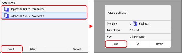 Pokud se zobrazí obrazovka se seznamem úloh, vyberte úlohu, kterou chcete zrušit, a stiskněte tlačítko [Zrušit]