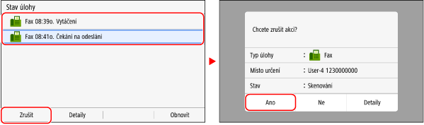 Pokud se zobrazí obrazovka se seznamem úloh, vyberte úlohu, kterou chcete zrušit, a stiskněte tlačítko [Zrušit]