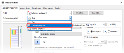 V položce [Způsob výstupu] vyberte možnost [Zabezpečený tisk].