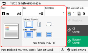 Zobrazí se obrazovka nastavení tisku z paměťového média.