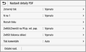 Tato obrazovka slouží ke konfiguraci podrobných nastavení tisku pro soubory PDF, například k určení stránek, které se mají vytisknout, a k úpravě kvality obrazu.