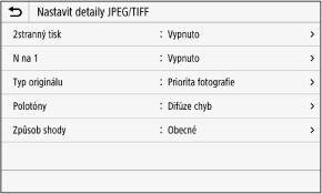 Tato obrazovka slouží ke konfiguraci podrobných nastavení tisku pro soubory JPEG a TIFF, například k úpravě kvality obrazu.