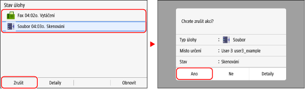 Pokud se zobrazí obrazovka se seznamem úloh, vyberte úlohu, kterou chcete zrušit, a stiskněte tlačítko [Zrušit]