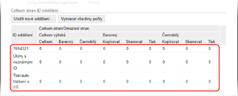 Když je povolena správa ID oddělení, můžete zobrazovat počet vytištěných a zkopírovaných stránek pro každé ID oddělení.