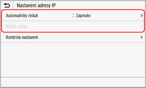 Normálně je nastaveno na [DHCP]. Pokud je však [DHCP] nastaveno v prostředí, kde nelze používat protokol DHCP, bude zařízení nadále potvrzovat automatické získávání v síti, což vytváří zbytečnou komunikaci. Když nepoužíváte protokol DHCP, nastavte tuto položku na hodnotu [Vypnuto].