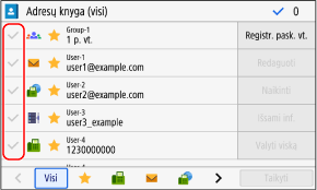 Jei adresatas adresų knygelėje nurodytas su „Parankiniais parametrais“, redagavimo arba ištrynimo veiksmas bus pritaikytas ir „Parankiniams parametrams“. Parankinių parametrų registravimas ir iškvietimas