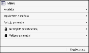 Automatinis parametrų valymasPagal numatytuosius parametrus, jei per tam tikrą laiką neatliekamas joks veiksmas, ekrane konfigūruojami parametrai bus išvalyti ir bus parodytas ekranas [Pagrindinis]. Galite pakeisti laiką, po kurio parametrai bus ištrinti, ir ekraną, kuris bus po to rodomas.