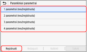 Galite registruoti parametrus pagal savo tikslą ir parametrus, kuriuos norite iškviesti kaip parankinius parametrus nuskaitymo, fakso ir kopijavimo funkcijoms.