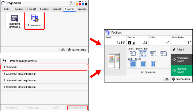 Naudodami nuskaitymo, fakso ar kopijavimo funkciją, iškvieskite parametrą iš registruotų Parankinių parametrų pagal savo tikslą.