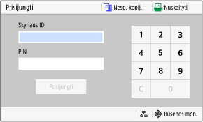 Nustačius skyriaus ID valdymą, bus parodytas toks prisijungimo ekranas. Norėdami prisijungti, įveskite skyriaus ID. Jei nustatytas PIN, įveskite jį.