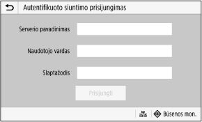 Jei nustatytas autentifikuotas siuntimas (LDAP serverio autentifikavimas), atliekant nuskaitymą ir siunčiant faksogramą, bus rodomas prisijungimo prie autentifikuoto siuntimo ekranas. Norėdami prisijungti, įveskite vartotojo vardą ir slaptažodį, tvarkomus LDAP serveryje.