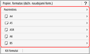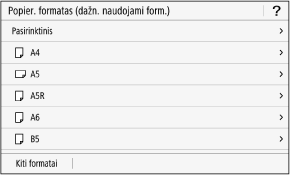 1 veiksmo ekrane galite pakeisti rodomą popieriaus formatą. Nenaudojamų popieriaus formatų paslėpimas