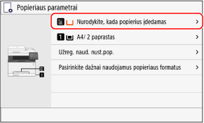 Jei daugiafunkciam dėklui visada naudojate tokį patį popierių, popieriaus formatą ir tipą galite užregistruoti. Taip nebus rodomas popieriaus parametrų ekranas, kurių jums nereikės konfigūruoti.